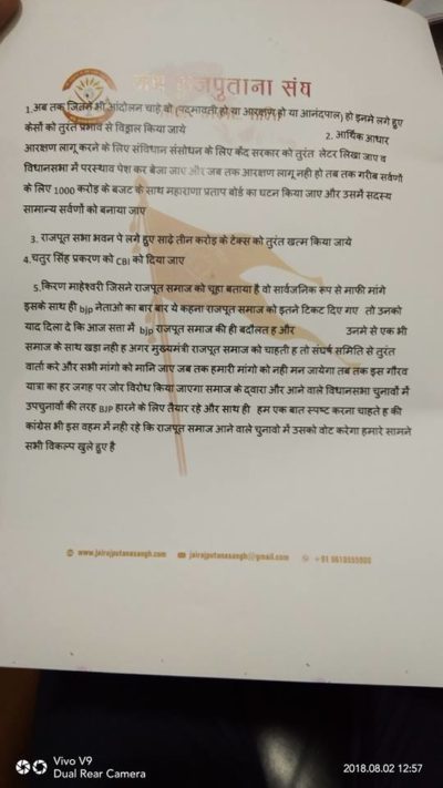 भंवर सिंह रेटा ने कहा कि नवम्बर में होने वाले विधानसभा चुनाव में राजस्थान की सीएम वसुंधरा राजे की झालावाड़ा तथा प्रदेश की उच्च शिक्षा मंत्री श्रीमती किरण माहेश्वरी के राजसमंद क्षेत्र से जमानत जब्त करवाई जाएगी। इसके लिए राजपूत और रावणा राजपूत समाज के हजारों युवा अभी से जुट गए हैं। वसुंधरा राजे सीएम रहते दोनों समाजों को कुलचने में कोई कसर नहीं छोड़ी तो माहेश्वरी राजपूत समाज का मजाक उड़ाते हुए चूहा कहा। राजपूत समाज को चूहा कहने की हिम्मत दिखाने वाली किरण माहेश्वरी को अब बताया जाएगा कि राजपूत समाज में कितनी ताकत है। रेटा ने कहा कि माहेश्वरी को चुनाव से पहले भी सबक सिखाया जा सकता है। इसके लिए समाज के युवक-युवतियों को तैयार किया जा रहा है।